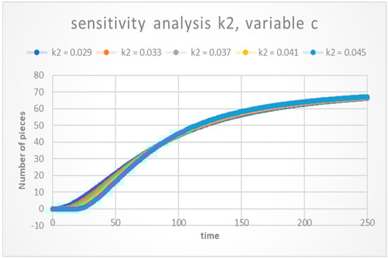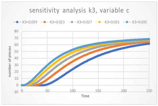 Figure 8 shows a sensitivity analysis for different scenarios of variable c. The value of k3 varies from 0.019 to 0.035, and in intervals of 0.004, where it provides us with important information when seeing different scenarios that change the values of k3, but none identifies the set time of 125 min which seeks 63.2% of the final value and a settlement time of approximately 180 min of (95–98%) of the final value.