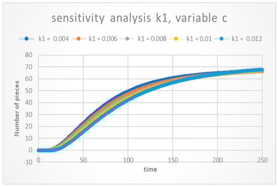 Figure 10 shows a sensitivity analysis for different scenarios of variable c. The value of k1 varies from 0.004 to 0.0012, and in intervals of 0.002. It is useful to have different results in the simulation model, which provides multiple results, but none identifies the set time above 125 min looking for 63.2% of the final value and a settlement time of approximately 180 min of 98% of the final value, which is the maximum achieved.