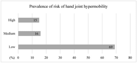 Fifteen percent of the 141 students were classified as being at a high risk of hypermobility, and 16% of them were classified as being at a moderate risk of hypermobility (Figure 2). The remaining 69% exhibited a low risk of hypermobility.