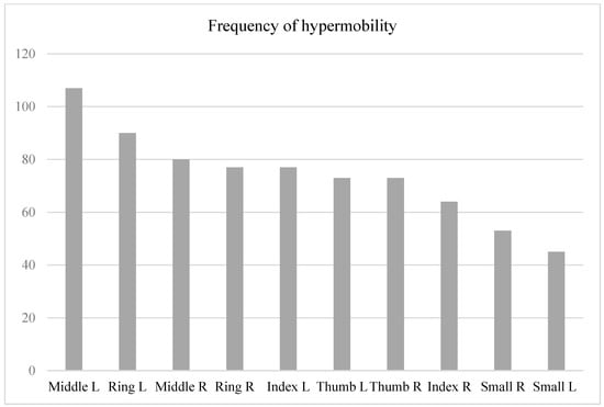 The fingers that were more significantly affected by hypermobility were the left middle finger, followed by the left ring finger, right middle finger, and right ring finger. The least affected in our student cohort were the right and left small fingers, as well as the right index finger. Figure 3 displays the frequency distribution of observed hypermobility according to finger and hand side.