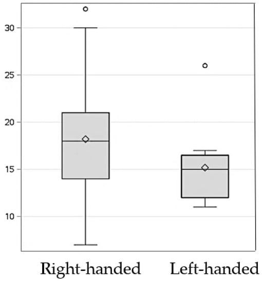 The male students had significantly higher right grip strength (36.9 ± 27.7 vs. 28.4 ± 20.3, t = 1.988, p = 0.049, 95% CI 0.04317–16.80384) and left grip strength (30.5 ± 23.3 vs. 22.9 ± 19.6, t = 1.974, p = 0.050, 95% CI −1.09295, 17.93996) than those of the females. The right-handed students exhibited scored significantly higher in right lateral pinch than left-handed students (18.2 ± 4.8 vs. 15.2 ± 4.1, t = 2.019, p = 0.045, 95% CI 0.616, 5.9813, Figure 4). The scores for right and left wrist extension did not differ between sex (p = 0.506 and p = 0.245, respectively) and ranged between 4.97 ± 0.2 and 5.00 ± 0.0.