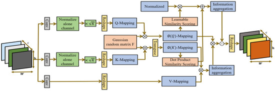 where and represent the module input feature map and the magnification factor, respectively; , , and represent feature transformation functions; and and represent the pixel information at positions and in the feature maps and , respectively. By setting r Gaussian random samples and concatenating these samples into a Gaussian random matrix , the Gaussian random feature map was further approximated as , where . Finally, an efficient nonlocal attention mechanism was obtained: