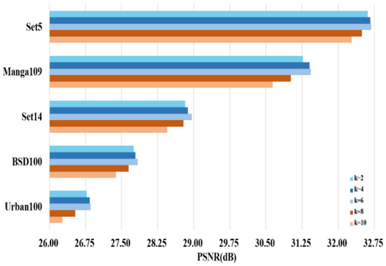 The PSNR value of the LNLCN model steadily increases with increasing k value. With a further increase in the amplification factor k, the performance of the model drops sharply. According to this experimental result, our inference is that increasing k causes the approximate variance of LNLCA to increase exponentially, which, in turn, leads to performance degradation. Therefore, setting k in the LNLCA module to six produces good results.