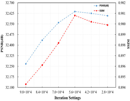 To explore the impact of ATG network iteration number settings on the network performance, we conducted more detailed ablation experiments. Specifically, the number of iterations of the ATG network was set to , , , , , and . We further evaluated the performance of the model on the Set5 dataset with a downsampling factor of four. Table 1 shows the experimental results under different iterations. Through the data, we explored the best iteration settings for LNLCN. As shown in Figure 5, setting the number of iterations of the ATG network to and produces the best performance indicators, and the improvement in the SSIM values at this time is considerable. In addition, too many iterations, such as , lead to model performance degradation; this may be because too many iterations cause the model to overfat the dataset and affect the generalization ability of the model. Thus, in our LNLCN, we finally set the number of ATG network iterations to to obtain the best reconstruction results. This result shows that our LNLCN model can effectively improve the quality and visual effect of super-resolution images with an appropriate number of iterations and has better practicality and application value.