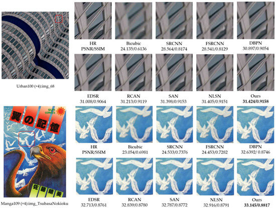To further demonstrate the superiority of the proposed LNLCN model, we compared our LNLCN model with nine state-of-the-art SISR models: SRCNN [13], FSRCNN [40], VDSR [14], EDSR [28], DBPN [49], RDN [50], FPAN [51], RCAN [15], ESRT [32], HNCT [34], SAN [20], HAN [52], and NLSN [31]. For comparison, we measured the PSNR and SSIM values on the Y channel of the reconstructed image using a MATLAB [53] function. Table 3 shows the degradation model reconstruction indicators of different methods at scaling factors of two, three, and four. The proposed LNLCN model achieves the best performance at various scaling factors compared to the other SR methods. This is mainly because, compared with the traditional nonlocal modules, we used the learnable nonlocal contrastive attention module to sparsely aggregate image-related information more effectively so that the network could focus on discriminating valid information. In addition, our ATG target training strategy could alleviate the ill-posedness of the super-resolution task by enabling the network to generate slightly different outputs, which is meaningful for obtaining super-resolution results that are satisfactory in reality and perception, especially in terms of generating pleasing images.