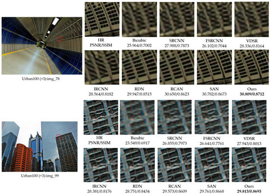 In Figure 7, we show the visual quality comparison of SR results with 3 × SR under the BD model. Taking “img_99” as an example, the architectural meshes reconstructed by some methods, such as IRCNN [54] and VDSR [14], have serious artefacts and do not match the reality. The methods with better performance are RDN [50], RCAN [15], and SAN [20], which produce natural overall mesh reconstruction results but still have the problem of detail texture blurring. Compared with these classic methods, our LNLCN can not only remove image texture blur but also restore high-frequency details, reconstructing relatively sharp edges and clear images. This is because we incorporate learnable nonlocal attention into each DFFAG module, which captures important features which are useful for image texture. IRCNN [54] and RDN [50] are specifically designed to handle image reconstruction tasks with the BD model, and our LNLCN achieves a numerical increase of nearly 1 dB PSNR compared to these models, which fully demonstrates the advantages of the proposed method.