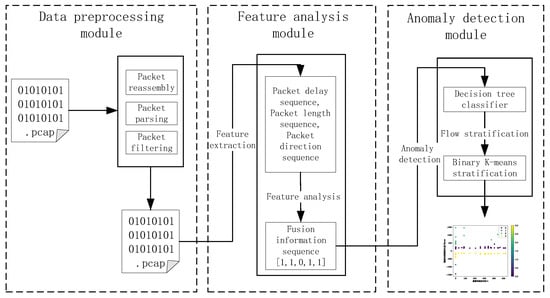 This module includes packet recombination, packet analysis, and packet filtering. Packet reassembly makes TCP packets separated and reassembled by the bi-direction flow. Packet parsing mainly analyzes the captured traffic layer by layer according to network protocols and generates readable network packet details for the feature extraction stage. Packet filtering filters out ACK packets without payloads based on the SYN and ACK flag bits and payload length of TCP packets to improve analysis efficiency.