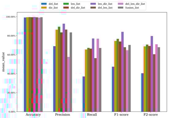 As we can see in Figure 6, Figure 7 and Figure 8, with the increase in the proportion of benign traffic, the results of the fusion feature sequences are relatively stable compared with original features. We infer that session features become diverse, causing it difficult to identify reverse shell traffic by original features merely. However, no matter how the proportion of traffic changes, the fusion information feature always conforms to the principle of reverse shell attack, so the detection effect is relatively stable.