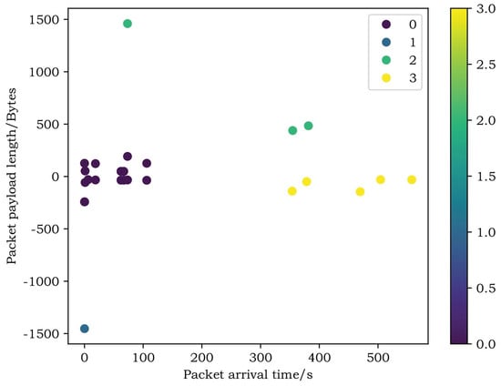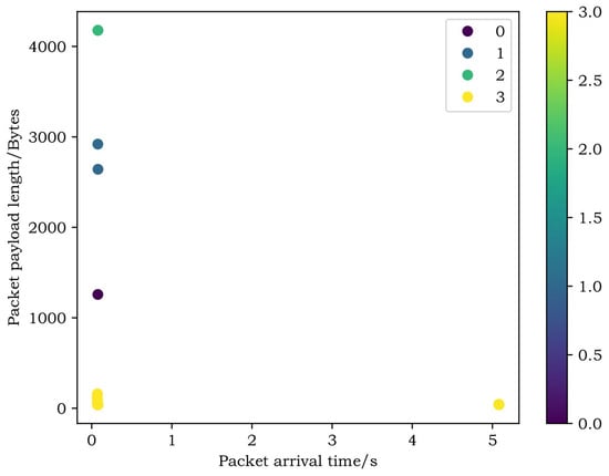 Figure 10 shows the traffic stratification results in the shellcode execution phase, and the reverse shell attack is implemented by the python/shell_reverse_tcp_ssl module. In the shellcode execution phase, the target returns the encrypted shell. Initially, the attacker delivers the malicious payload to the target, corresponding to the blue cluster below the axis of X equals 0. in Figure 10. Then, the encryption protocol negotiates, bi-direction packets interact frequently and have symmetrical lengths. This process is very short-lived and corresponds to the purple cluster in Figure 10. After the shell is returned successfully, the attacker usually executes commands to obtain information about the target. In general, the data flows to the attacker. Typically, packets carrying commands are short in length and relatively dispersed; however, the target machine needs to return corresponding execution results according to different commands, so the packets carrying execution results have different lengths, corresponding to the green cluster and yellow cluster on either side of the axis of X equals 0 in Figure 10.
