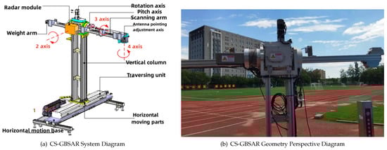 Figure 1a is the CS-GBSAR system diagram. In Figure 1a, Label 1 is the horizontal motion base to move the whole radar and rotation structure forward and backward. Axis 2 is the rotation center along with a radar antenna and weight arm at both sides, which the radar would rotate around axis 2 to form the synthetic aperture. Axis 3 and 4 are the pitch axis and antenna pointing adjustment axis, respectively, which are used to adjust the radar’s looking direction.
