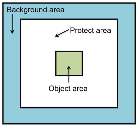 The general process of CA-CFAR detection is as follows. It first utilizes the size of the detection window based on the size of the target to be detected. The classic hollow sliding window is shown in Figure 3, comprises the target area, protected area, and background area. The blue region represents the range of values, which is used to calculate the threshold . The white area represents the protected area, and the data in this area do not do any calculation. Then, compute the mean and variance based on a suitable number of pixel values around the target area selected by the sliding window. Then, using the given false alarm probability and the computed mean and variance, the threshold is determined. Finally, move the sliding window by point across the image, and at each position, the threshold is calculated and compared against the central pixel of the sliding window to determine whether it corresponds to a target point.