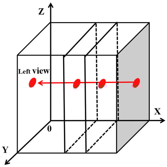 Figure 6. Three-view projection diagram.3D data are , the projection left-view , where is the direction vector of X axis; the projection front-view , where is the direction vector of Y axis; the projection top-view , where is the direction vector of the Z axis. As shown in Equation (7). - The first step CFARThe first step CFAR is to apply conventional CA-CFAR to the three-view image to obtain the three-view mask, as shown in Equation (8). They are left-view mask , front-view mask and top-view mask .where:: is left-view;: is front-view;: is top-view;: is left-view mask;: is front-view mask;: is top-view mask.By inverse projecting the three-view mask, the volume mask in the original 3D image is obtained, which is subsequently intersected with the SAR 3D image. This can remove strong sidelobes outside the potential target region and obtain potential target area data. Figure 7 depicts the process schematic. In Figure 6 and Figure 7, red, green, and blue correspond to the projections of pixels in the left view, the main view, and the top view, respectively. The purple sphere represents the intersection of projections in all data.