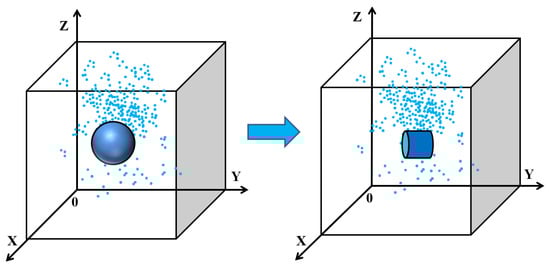 - The modified DBSCANIn response to the uneven cluster density of 3D data target points and their often linear structure in the vertical plane, we have proposed a modification to the conventional DBSCAN clustering algorithm. By imposing more constrained clustering conditions, we aim to obtain more accurate results for such cases. Specifically, we have introduced a change to the shape of the clustering metric from a sphere to a cylinder, as illustrated in Figure 8. This adjustment is particularly useful in addressing scenarios where there may be significant variation in point densities both within and between clusters. In Figure 8, the blue scatter points represent the pixels in the data. The blue sphere and the blue cylinder are the clustering constraint shape of the traditional DBSCAN method and the modified DBSCAN method, respectively.