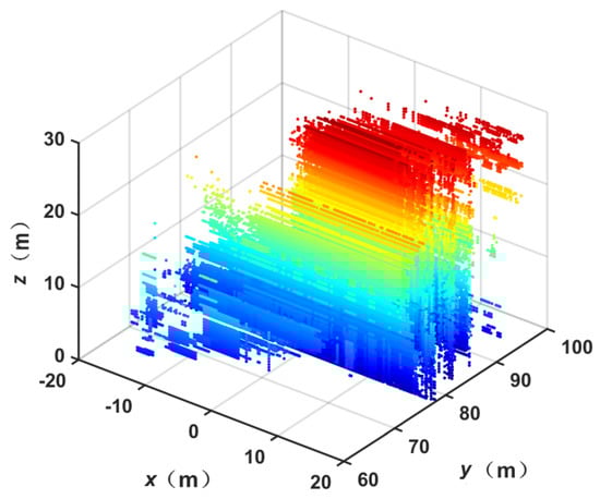 The CS-GBSAR 3D image is in 201 × 401 × 401 size. The whole window size is 50 × 50, the size of the guard region is 30 × 30 and the pixel for detection is one pixel. The selection of false alarm probability affects the threshold directly, where targets will be missed if the threshold is too large and false alarms will increase if it is too small. For our SAR 3D image, we set the false alarm probability to 0.1, as recommended by empirical parameters. Using these masks, we obtain the volume mask in original 3D images via inverse projection. Then, we can obtain potential target area data by intersecting it with the SAR 3D image as depicted in Figure 13. The color of the point cloud in Figure 13 is changed according to the height, and different colors are used to distinguish the height.