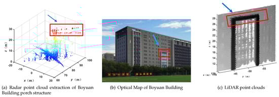 In the second step of CFAR target detection, we utilize a global two-parameter CFAR algorithm to detect and generate more precise target points from the masks applied to the extracted data, which results in the initial extraction of 3D point clouds illustrated in Figure 14. To validate the results, Figure 15a–c presents a comparison between 3D point, optical image and LiDAR point clouds of the porch structure of the Boyuan Building. Meanwhile, the red boxes in all three subfigures mark the porch structure of the Boyuan Building.