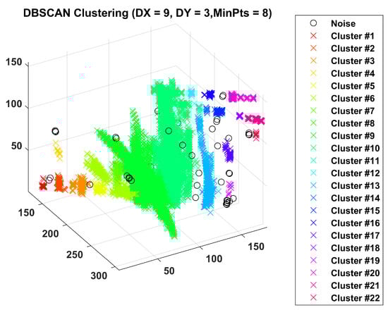 To implement the mDBSCAN, three parameters, r, h, and MinPts, should be set. Based on empirical testing, the radius is set to 9 pixels, the cylinder height h is 3 pixels, and the density threshold MinPts is 8. The clustering results are illustrated in Figure 16. Each cluster is labeled with a unique color in the image. The number of all clusters is 22, we can see that the typical structures are all classified, and the noise points are less in the whole data. This figure demonstrates the successful separation of the target area from the remaining strong sidelobe point clusters, achieved through the modified DBSCAN clustering algorithm.