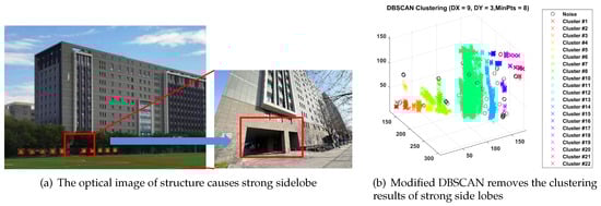 The laser detection and ranging (LiDAR) data in this paper are the external truth data. LiDAR is an active remote sensing technology that can generate accurate and high density 3D point cloud data. It can be used for generating high precision 3D models. Here, we use it to verify the accuracy of the method-extracted 3D structure of the porch structure of the Boyuan Building. In practice, we compare the length and height of the porch between LiDAR and the proposed method. The experimental truth value comparison table is shown in Table 2. We know from the experiment that the length of the porch structure in LiDAR point clouds is 10 m and the height is 28 m. The length of the porch structure in the detected 3D target point cloud is 11.67 m and the height is 28.4 m. The estimation difference in length and height are 1.67 m and 0.4 m, respectively, which is relatively close [29,30]. We can conclude both the radar and LiDAR point clouds match the length and height information of the two current porch structures of Boyuan Building as depicted in the optical image. The next step is to applied mDBSCAN to classify the points into cluster, so that the false detections can be reduced.