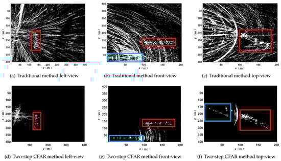 This section presents the method comparison experiment to demonstrate the necessity of the proposed method, i.e., the classical two-parameter CFAR layer-by-layer detection algorithm and the two-step CFAR detection algorithm. Subsequently, both the traditional DBSCAN clustering algorithm and the modified DBSCAN clustering algorithm were applied to extract the point cloud and suppress false alarms.