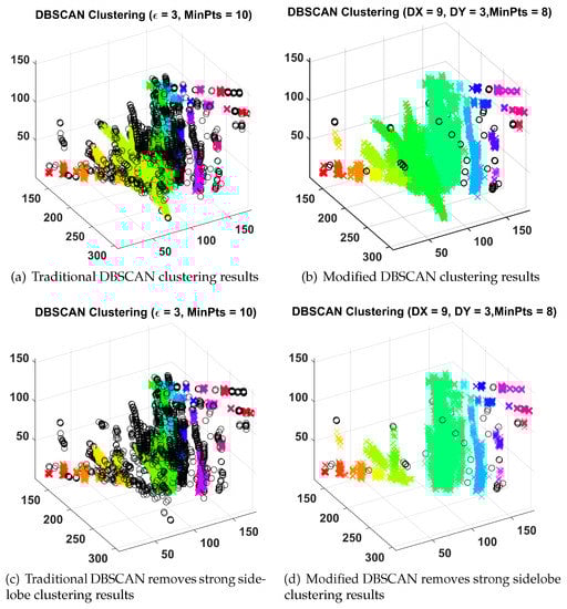 Figure 20 illustrates the comparison results of 3D point cloud clustering using two different methods: (a) is the traditional DBSCAN clustering result; (b) is the modified DBSCAN clustering result; and (c,d) are two method results from removing the strong sidelobe. Although both the methods classify targets and strong sidelobes into separate clusters, the traditional DBSCAN clustering result contains more noise points, which are wrongly classified. In such condition, it is impossible to accurately cluster and distinguish the target class and the strong sidelobe class, and the false alarm suppression effect is poor. The conventional DBSCAN clustering algorithm noise class contains 1225 points, while the modified DBSCAN clustering algorithm noise class contains 56 points. The comparison experiment shows that the proposed method can reduce 95.4% false clustered points and remove the strong traces, which shows the better performance of the proposed method. The modified DBSCAN algorithm has less noise points in the clustering results. It can distinguish the target from the residual strong sidelobes while maintaining a certain noise reduction ability. It restores the positioning information of each point cluster greatly, making the point cloud extraction results more accurate and the target clearer.