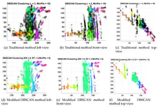 In a similar way, the three-view comparison results are demonstrated through 3D point cloud clustering as in Figure 21. Figure 21a–e are three view of point cloud results generated by conventional DBSCAN and a modified DBSCAN algorithm, respectively. The traditional method left view, front view, and top view consecutively illustrate that traditional DBSCAN clustering outcomes contain a lot of noise, mistakenly classifying more positioning points as noise. The modified DBSCAN algorithm correctly identifies strong sidelobe point clusters diffused in the whole data and separates them from the target and strong side lobe point clusters. The modified DBSCAN algorithm reduces noise significantly and extracts more accurate target spatial distribution information. Hence, precise extraction of a 3D SAR image target point cloud is achieved.