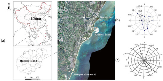 The study area was the waters around an artificial island—in, Qionghai City, Hainan Island. The artificial island is the only artificially reclaimed island in Boao Town, Qionghai City, Hainan Province, about 6.8 km north of the mouth of the Wanquan River (Figure 1a). The study area is a tropical monsoon climate, with an average annual temperature of about 25.0 °C and an average annual precipitation of 2103.0 mm. According to the wind data from Qionghai-Wanning Meteorological Station, from 1981 to 2010, the average annual wind speed in Qionghai was 2.2 m/s, and the prevailing wind direction was mainly southerly in summer and northerly in winter. Spring and autumn represent the transition seasons between the two wind directions (Figure 1b). The tides were irregular semi-diurnal tides. The normal wave direction throughout the year was southeast, which was the main wave direction. At the same time, the coast will be affected by the Taiwan wave and the near sea wave; the sub-normal wave direction was SSE; the strong wave direction was ESE, SE, and SSE; and the SE and SSE wave directions account for 68% of the total frequency (Figure 1c).