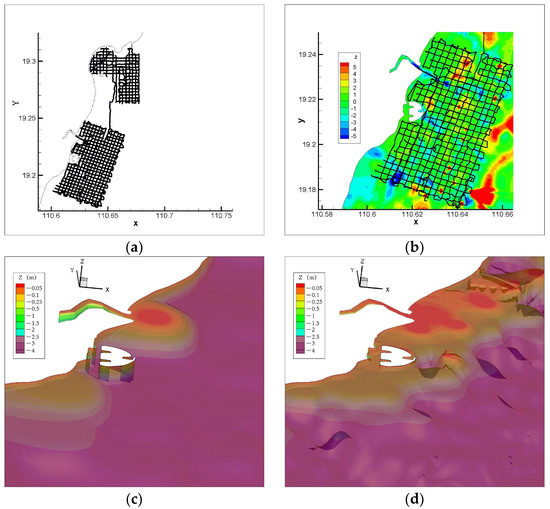 At the same time, we collected the spatial resolution of 2 km of global water depth ETOPO1 figures released by the American NOAA (https://www.ngdc.noaa.gov/mgg/global/, accessed on 15 July 2021). Due to the low spatial resolution of ETOPO1 data, which cannot accurately reflect the local topography around the artificial island (Figure 3c), the measured and collected data needed to be fused to form more accurate bathymetric data (Figure 3d) that can reflect the scour pits and silts around artificial island more clearly, in addition to more detailed siltation patterns at the mouth of Tanmen Port. Then, we interpolated the fused water depth data into the grid by using the inverse range interpolation method, which was used as the initial water depth condition for this study and laid a foundation for the numerical simulation of water and sediment in the complex near-shore environment.