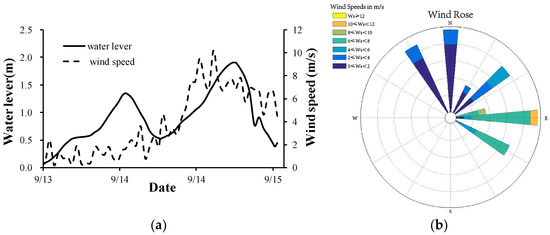 Water level and wind field recorded during Typhoon 19, 2017, in Gangbei Town. (a) Curve of typhoon water level and wind speed. (b) Typhoon transit wind speed rose chart.