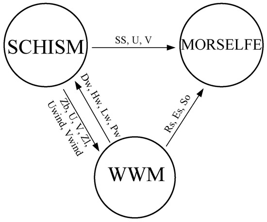 SCHISM, WWM-III, and the MORSELFE model all adopt an MPI parallel communication mechanism and use the same subregions and calculation grid, and so, there is no need to perform interpolation calculations. Compared to the use of couplers to perform interpolation conversion between grids of different types and resolutions, the hard-coded coupling mode in this study avoided the problem of interpolation error. Because SCHISM, WWM-III, and the MORSELFE model used different discrete time formats, different computing time steps were adopted, and the information exchange of the models was performed at a certain frequency set by the user. As shown in Figure 7, during information exchange, water level (Zl), seabed topography (Zb), wet and dry terrain markers and velocity (U, V) of SCHISM and some meteorological driving data, including wind speed (Uwind, Vwind) and air pressure, are transferred to WWM-III. The wave direction (Dw), wave height (Hw), wave length (Lw), and wave period (Pw) of WWM-III were transferred to SCHISM. Radiation stress (Rs), energy dissipation (Es), and orbital wave velocity (So) calculated by WWM-III were unidirectionally transferred to the MORSELFE model, while the suspended sediment concentration (SS) and velocity (U, V) calculated by SCHISM were unidirectionally transferred to the MORSELFE model. The above variable exchange was completed in memory, and the efficient communication mechanism based on the MPI library realized the variable exchange on different processes.