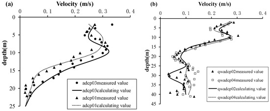 ADCP velocity verification ((a) qwadcp 01 and qwadcp 03 measurement points; (b) qwadcp 02 and qwadcp 04 measuring points).