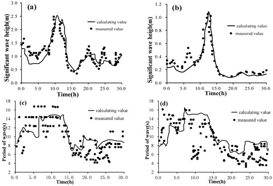The significant wave height Hs (m) and wave period Tp (s) measured at the four measuring points in Figure 2 were used to verify the calculation accuracy of WWM-III. As shown in Figure 9a, the significant wave height of the qwadcp02 measuring point far from the coast reached 2.5 m, and the unsteady process was more obvious. At the qwadcp01 measuring point near the mouth of the Wanquan River in Figure 9b, the significant wave height of wind waves reached the maximum value of 1.2 m at 12 h, because it was affected by the runoff of the Wanquan River. The runoff of Wanquan River was opposite to the higher tidal current of open sea and cancelled each other out, making the wave height smaller than that of open sea area, which reflected the spatial difference of wind waves. The wave periods in Figure 9c,d show that the difference in the wave periods between these two measuring points was not significant, and both varied between 6 and 18 s. In general, the calculated results of WWM-III were in good agreement with the measured data and, thus, reflected the wave characteristics around the artificial island.