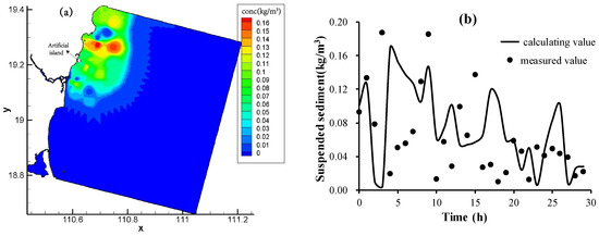 Due to the limitations of offshore real-time observation operation conditions, the effective time series values of the suspended sediment concentration were only obtained at qwadcp02, but the instantaneous values of suspended sediment concentration were obtained from 13 points around the artificial island and the waters near the mouth of the Wanquan River. These values were used as the initial distribution conditions of the suspended sediment concentration via spatial interpolation into the calculation grid, as shown in Figure 10a. The surface suspended sediment concentration over Tanmen Harbor formed two high concentration zones (about 0.15 kg/m3) and one low concentration zone (sediment concentration <0.01 kg/m3); the concentration at the entrance of Tanmen Port was very low, and a high sediment content area was formed in the offshore area (sediment concentration >0.35 kg/m3). The formation of areas with high sediment concentrations was related to human activities near the artificial island and fishing ports. The measured suspended sediment concentration at qwadcp02 showed no significant rule, but it was roughly consistent with the variation trend of the calculated value, as shown in Figure 10b, which showed a decreasing trend during the simulation period.
