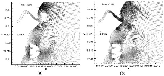 Vector diagram of velocity around the artificial island ((a) surge tidal current field; (b) plunging tidal current field) [the x-axis is the east longitude axis and the y-axis is the north latitude axis].
