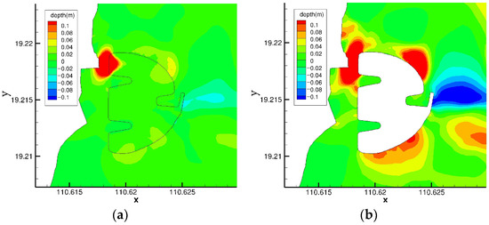 In order to further simulate the influence of the artificial island on regional changes in scour and siltation, we simulated an ideal scenario of the complete removal of the artificial island. The simulation compared the distribution of topographic scour and siltation thickness around the artificial island one year after its removal and combined the results with the actual situation of active beds of the seabed surveyed by drilling, that is, the thickness of the quaternary was generally less than 2 m. The results show that in the case of the artificial island, as shown in Figure 12a, about 0.1 m of siltation occurred between the island and shoreline and on both sides of the island, with a −0.1 m scour thickness behind it. After the removal of the artificial island, as shown in Figure 12b, the erosion and siltation on both sides of and behind the island decreased (the thickness was less than 0.05 m) and tended to return to the natural bed morphology. However, the siltation morphology remained at the local location of the shore at 0.1 m.