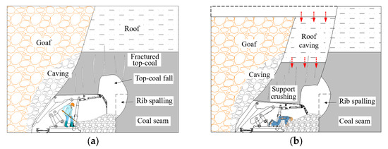 Accidents caused by rib spalling of the coal wall. (a) Top-coal falling to the working face. (b) Roof caving that induces support crushing.