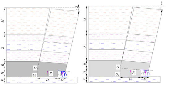 Without considering the hinge relationship of rock blocks, a mechanical model of stress on the coal wall in the fully mechanized working face was built by taking the critical state of breaking of the main roof (Figure 3) [2]. In Figure 3, point O represents the point of action of the moment; F, H, R, Z, and M denote the floor thickness, coal cutting height, height of top coal, thickness of the immediate roof, and thickness of the main roof, respectively; α and β denote the angle of rotation of strata of the main roof and caving angle of strata, respectively; D1 and D2 denote the distance from the coal wall to the breaking line of the main roof and the length of top beam of the top-coal caving support, respectively; P1 and P2 indicate the support forces provided by coal wall and the support to the top coal, respectively.