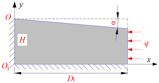 The stiffness of the main roof and the immediate roof of the coal seam is greater than that of top coal, so it can be considered that the upper boundary of the coal wall is a given deformation boundary, while the lower and left boundaries can be regarded as fixed boundaries. q denotes the force of the sidewall-protecting plates of the support acting on the coal wall. The mechanical calculation model of the coal wall was established (Figure 5). The size of the coal wall in the dip direction of the working face is much larger than that along x and y directions, so this problem should be a plane-strain problem.
