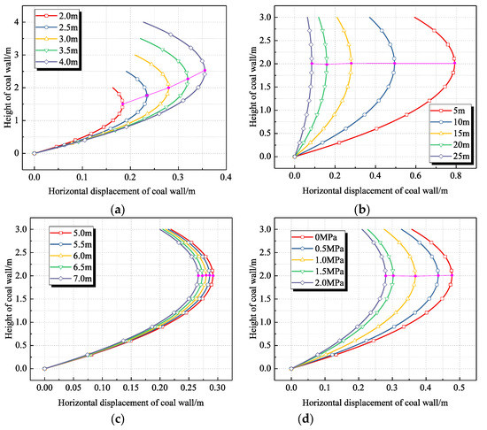 According to the strata occurrence and prevailing mining conditions at the 31,204 working face, ρR = 1280 kg/m3, ρZ = 2440 kg/m3, ρM = 2675 kg/m3, Z = 13.4 m, M = 12 m, E = 18 MPa, and μ = 0.3. By changing the parameters of the external influence factors, the horizontal displacement of the coal wall was plotted (Figure 6). The figure shows the horizontal displacement of the coal wall under the effects of different external influencing parameters.