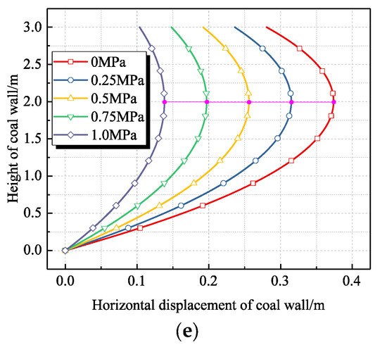 - With the increase in the support strength, the pressure of the overlying strata undertaken by the coal wall decreases, and the horizontal displacement of the coal wall reduces. As shown in Figure 6d, when the support strength is increased from 0 to 1.5 MPa, the maximum horizontal displacement decreases from 0.48 to 0.30 m. The horizontal displacement significantly decreases with increasing support strength. As the support strength is increased from 1.5 to 2.0 MPa, the maximum horizontal displacement decreases from 0.30 to 0.28 m. That is, with the further increase in the support strength, the horizontal displacement slightly reduces, indicating that 1.5 MPa is the critical support strength. Below this strength, the horizontal displacement of the coal wall is sensitive to changes in the support strength; above this strength, it is insensitive to changes in the support strength.