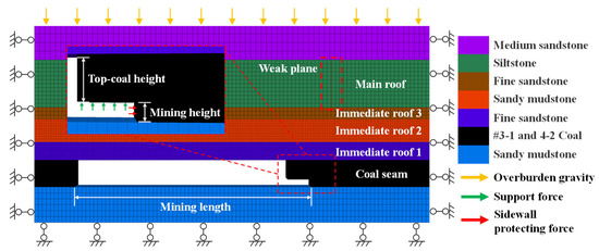 Based on the prevailing geological conditions around the 31,204 working face in the Cuncaota II Coal Mine, a model of the fully mechanized caving face was established using Flac3D numerical simulation software to conduct sensitivity analysis on the failure of the coal wall to various influencing factors. The established model measured 100 m × 280 m × 50 m (length × width × height). The self-weight of the overlying strata was replaced with a uniformly distributed load applied to the top; both the sides and the bottom of the model were limited by displacement-controlled boundary conditions. The support strength and sidewall-protecting force of the support were represented by an equivalent applied load. The main roof was broken by inserting a vertical weak plane in the main roof at a position a certain distance in front of the working face. In the initial equilibrium state of the model, the parameters of the main roof were assigned to the weak plane. When the coal seam was excavated to the designated position, the weak plane was reassigned to reduce the relevant parameters including cohesion, thus simulating the breaking of the main roof. The model is displayed in Figure 7. According to the test schemes (Table 2), the simulation was conducted. The horizontal displacement of the coal wall and the volume of the plastic zone in the coal wall in unit length of the dip direction were taken as the indices for evaluating the rib spalling of the coal wall [27,28]. The specific schemes and results of the orthogonal tests are summarized in Table 2.