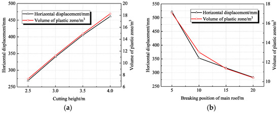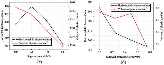 The change curves of the horizontal displacement and the volume of the plastic zone for various factors. (a) Cutting height. (b) Breaking position of main roof. (c) Support strength. (d) Sidewall-protecting force.