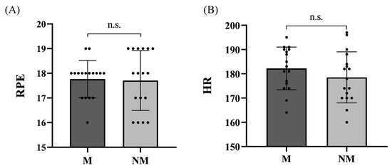 Listening to self-selected music during the warm-up had no significant effect on RPE (p = 0.854, (A)) and HR (p = 0.222, (B)) after the Wingate test. RPE, rating of perceived exertion; HR, heart rate; M, music intervention; NM, no music intervention; n.s., no significance. The dots represent the raw data.