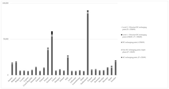There are a number of charging stations of different types that have been installed in the last decade in European Union, ranging from a few kW to 475 kW. Several incentives for the installation of charging infrastructure, both public and private, for electric vehicles have been introduced and are being assessed as to their effectiveness [15]. In the EU, countries such as the Netherlands, France, Germany, and Italy show the highest numbers (as shown in Figure 1), and there has been continuous and rapid growth in recent years.
