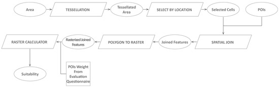 The remaining cells represent areas with potential infrastructure needs. However, not all of them are suitable for the installation of new charging points. Usually, the spatial distribution of infrastructures is not homogeneous in the territory, but it is strongly correlated with the spatial distribution of POIs [46]. According to OpenStreetMap Wiki, a POI is a specific point location that someone may find useful or interesting and that may therefore attract people. Since a POI affects the suitability of areas for the installation of the new infrastructures, the most relevant ones in terms of private electric mobility were included in the analysis and were grouped into three categories according to their general function (see Table 3).