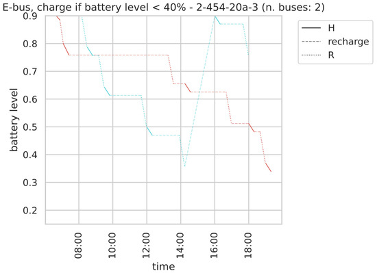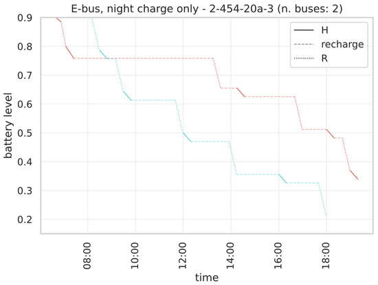 - Routes that can be satisfied only by using multiple recharge options, i.e., during the night in the depot, as well as when the bus stop is longer than 10 min and when the battery level is lower than 40% (opportunity charging);