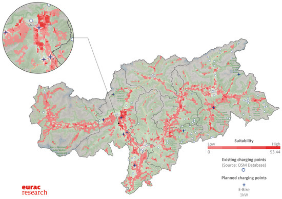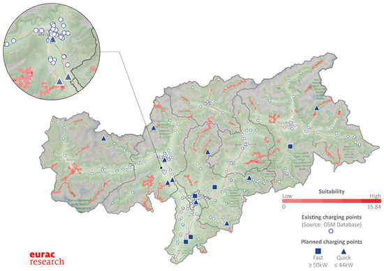 According to the results of the analysis, suitable areas for the installation of new charging points for EVs are mostly located in the inner parts of the province (see Figure 6). In fact, South Tyrol already has a well-established infrastructure that covers the majority of the provincial territory. Therefore, in some cases, new inlets have been placed in areas with no charging infrastructure yet (but also less traffic); in other cases, the new infrastructure has been set in proximity to existing ones with the purpose of creating charging hubs based on high utilization rates and high traffic (e.g., in industrial or commercial parking lots). In total, within the MOBSTER project, 15 charging points for EVs have been installed in South Tyrol (5 Fast, 10 Quick).
