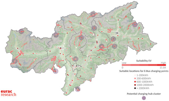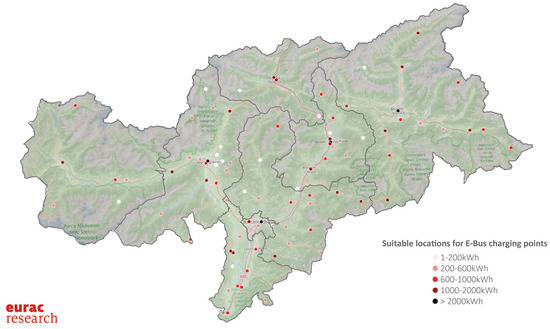 The work presented in this paper was developed within the framework of the two projects. The MOBSTER project “Electric mobility for sustainable tourism” (2019–2022) is an EU-funded project within the Interreg Italy-Switzerland Cooperation Programme. The main project aim is to encourage the spread of electric mobility and promote sustainable tourism in cross-border regions of Italy and Switzerland. One of its specific goals is to investigate the need for electric mobility infrastructures for private transport (electric passenger vehicles and e-bikes for individual use). The second project, “Evaluation of different scenarios to switch the regional bus fleet of an Italian alpine region to zero-emission buses” (2020–2021), was commissioned to Eurac Research by STA—Strutture Trasporto Alto Adige S.p.A.—to analyze the feasibility of replacing the whole provincial bus fleet (around 750 buses) with zero-emission buses. Following this request, the need for locating the charging infrastructure was also analyzed.