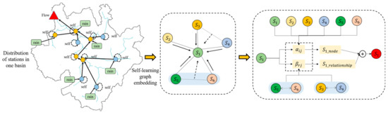The effective implementation of the above data-driven and knowledge-guided prediction theory relies on machine learning prediction models. Among these, depth neural networks are one of the most representative machine learning methods. Flood prediction methods of deep neural networks mainly include RNN-based prediction methods [6], LSTM-based prediction methods [7], and GRU-based prediction methods [8]. The above intelligent methods mainly start from the perspective of Euclidean data regression, ignoring the important physical structure of the basin itself and the spatiotemporal characteristics of data features. Accurate flood prediction needs to be based on the physical structure of the watershed itself and the spatiotemporal characteristics of the data [9]. The prediction method based on the graph neural network model [10] extends the deep learning model to non-Euclidean space, and can extract the spatiotemporal characteristics of the flood physical field in parallel. It fully considers the physical structure within the watershed, namely, various spatial topological connections. At present, research on flood forecasting methods based on graph neural networks mainly focuses on isomorphic and heterogeneous graphs [11]. Among these, isomorphic graphs only have one type of node and edge, which corresponds to the field of flood prediction, that is, only one type of station and its runoff direction relationship are predicted, which clearly does not comply with the physical mechanism of flood basins. Considering the spatiotemporal complexity of flood processes, modeling them as heterogeneous maps containing multiple types of nodes and edges can achieve more detailed and comprehensive flood processes. By combining the different attribute features of different hydrological stations to extract a wide range of spatiotemporal features, more accurate flood spatiotemporal prediction can be achieved [12].