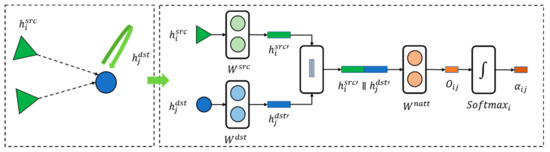 The node focus module maps the source node state and the target node state to the same space through the linear layer weights and , respectively. After the splicing operation, the initial node weight is calculated through the full connection layer weight , and then after the normalization and activation operation.