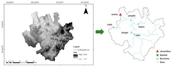 In order to better compare the performance of the proposed method and baseline model, the Qijiang Basin in Chongqing, China was selected as the experimental target basin, and relevant measurement data from the Qijiang Basin in Chongqing were used for the experiment. The flow data used in the experimental watershed come from hydrological stations within the watershed, including six rainfall stations (Wucha, Caijia, Shijiao, Xinlu, Dongxi, and Yangshi) and one flow station (Wucha). Figure 7 shows the distribution of stations in the experimental watershed. From the graph, it can be seen that there is a certain spatial correlation between the upstream and downstream stations in the watershed. The meteorological data used in the experiment were from mobile phones and the National Meteorological Information Center of China. Specific types of meteorological data include evaporation data, rainfall data, temperature data, and wind speed data. The input for the experiment includes previous data from 1 to 12 days (including the current). The output is runoff data for the next 1–6 days. The time span of the Qijiang River Basin dataset is from 1 January 1979 to 31 December 2020. The data granularity is one item per day. Due to the fact that the above data usually follow a relatively clear data distribution, in order to better partition the dataset while maintaining the data distribution, this study used a random shuffling method to shuffle the original dataset to approximate the random distribution. Then, through linear partitioning, the original dataset is divided into training, validation, and testing sets in different proportions.