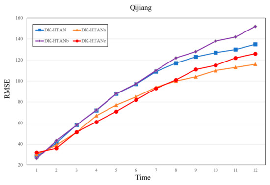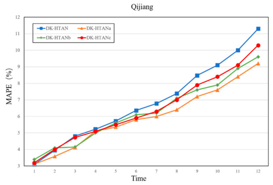 Figure 9 and Figure 10 show the performance impact of different attention-type combinations on the DK-HTAN model. On the Qijiang Basin dataset, the overall performance of different models is similar. However, the type of attention model has a certain impact. The performance of the weighted model is in the middle, although intuitively, the model using DK-HTAN with weighted attention should perform better than the model using only average attention modules. However, in this experiment, the experimental results are different from the expected assumptions: the mean-type relational attention module can enhance the performance of the model more, and the weighted-type node attention module can enhance the outcomes of the model more. In general, weighted attention has a positive effect on model performance, while average attention has a stabilizing effect on model performance. However, due to the error characteristics of neural network model training, the training quality has a certain impact on the performance of the weighted attention module. If the training quality of the weighted focus module is not enough, the performance of the model may not be improved. At the same time, considering that the most important prior relationship has been put into the model when modeling, its mean relational attention module can better reflect the performance of the model. Although in this part of the experiment, the weighted focus method did not always maintain its advantages, it still showed good performance. At the same time, the overall performance of the DK-HTAN model surpassed other baseline models and other defined models.